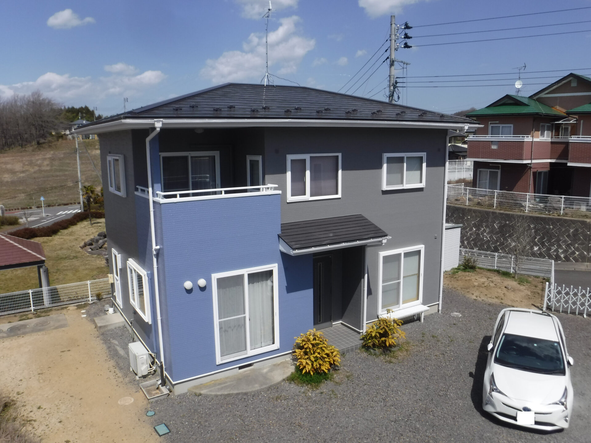 屋根:スーパーシャネツサーモSi キャビアブラウン 外壁:プラチナシリコンREVO2000-IR スレートブルー ・ ミネラルグレイ