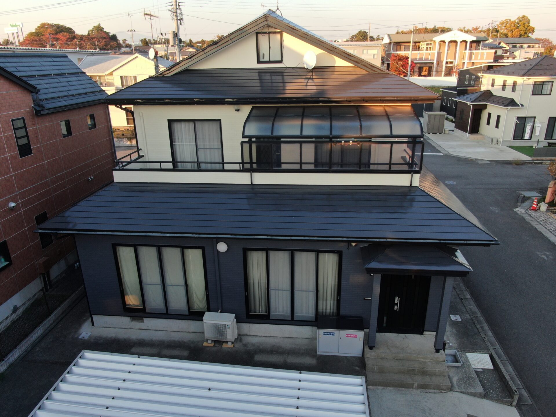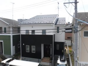 ツートーンカラーでお洒落な印象のお家になりました。 【屋根】スーパーシャネツサーモF(カーボングレー) 【外壁】超低汚染プラチナリファイン2000Si-IR(1F ニュートラルホワイト、2Fニンバス)