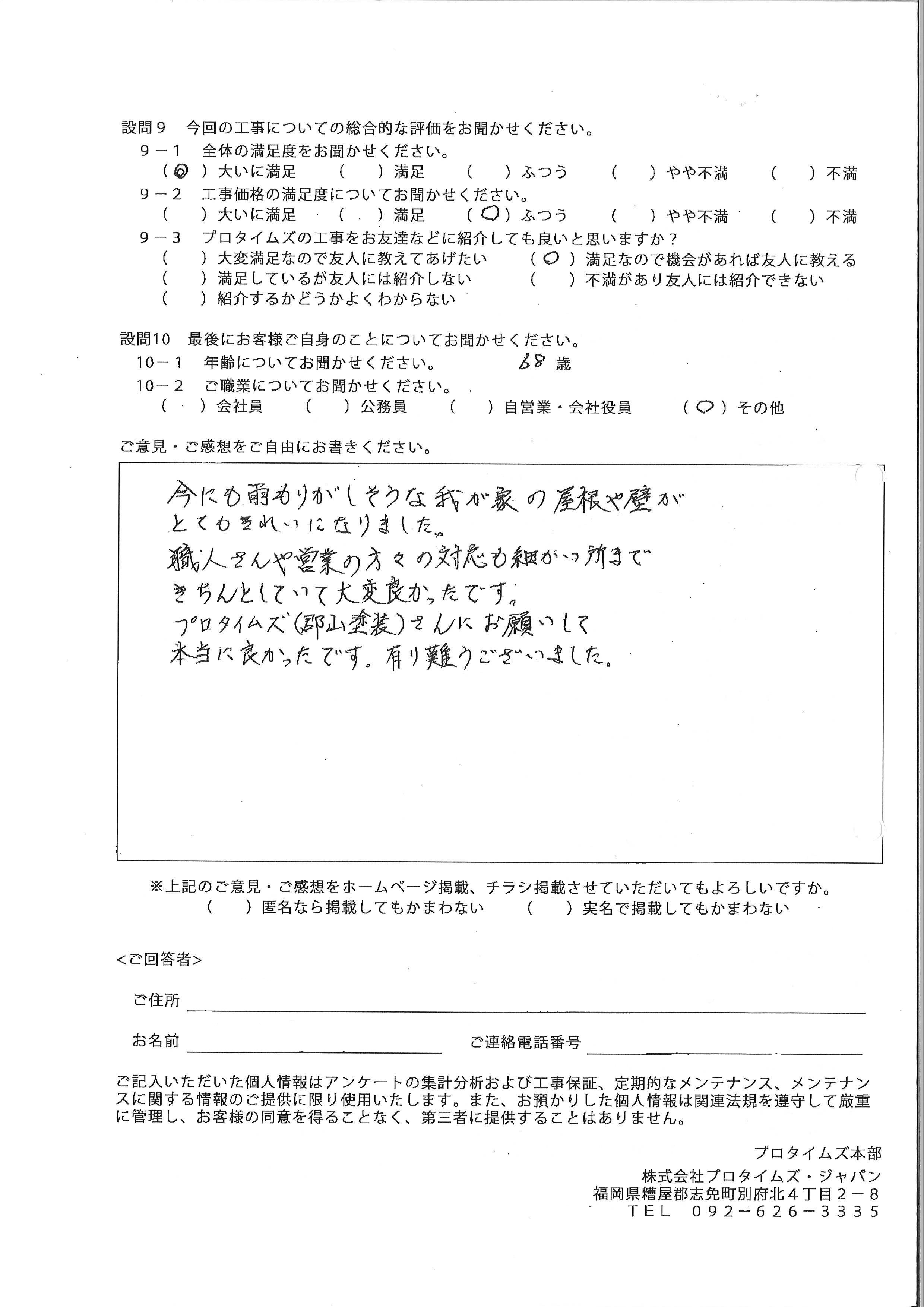 今にも雨もりがしそうな我が家の屋根や壁がとてもきれいになりました。職人さんや営業の方々の対応も細かい所まできちんとしていて大変良かったです。プロタイムズ(郡山塗装)さんにお願いして本当に良かったです。有り難うございました。